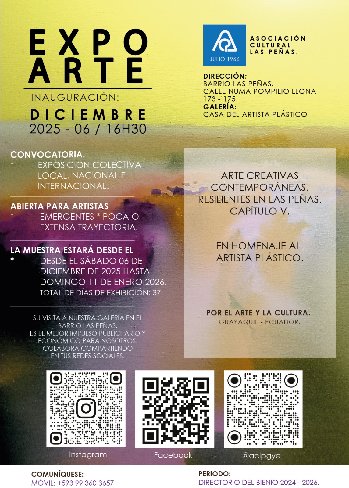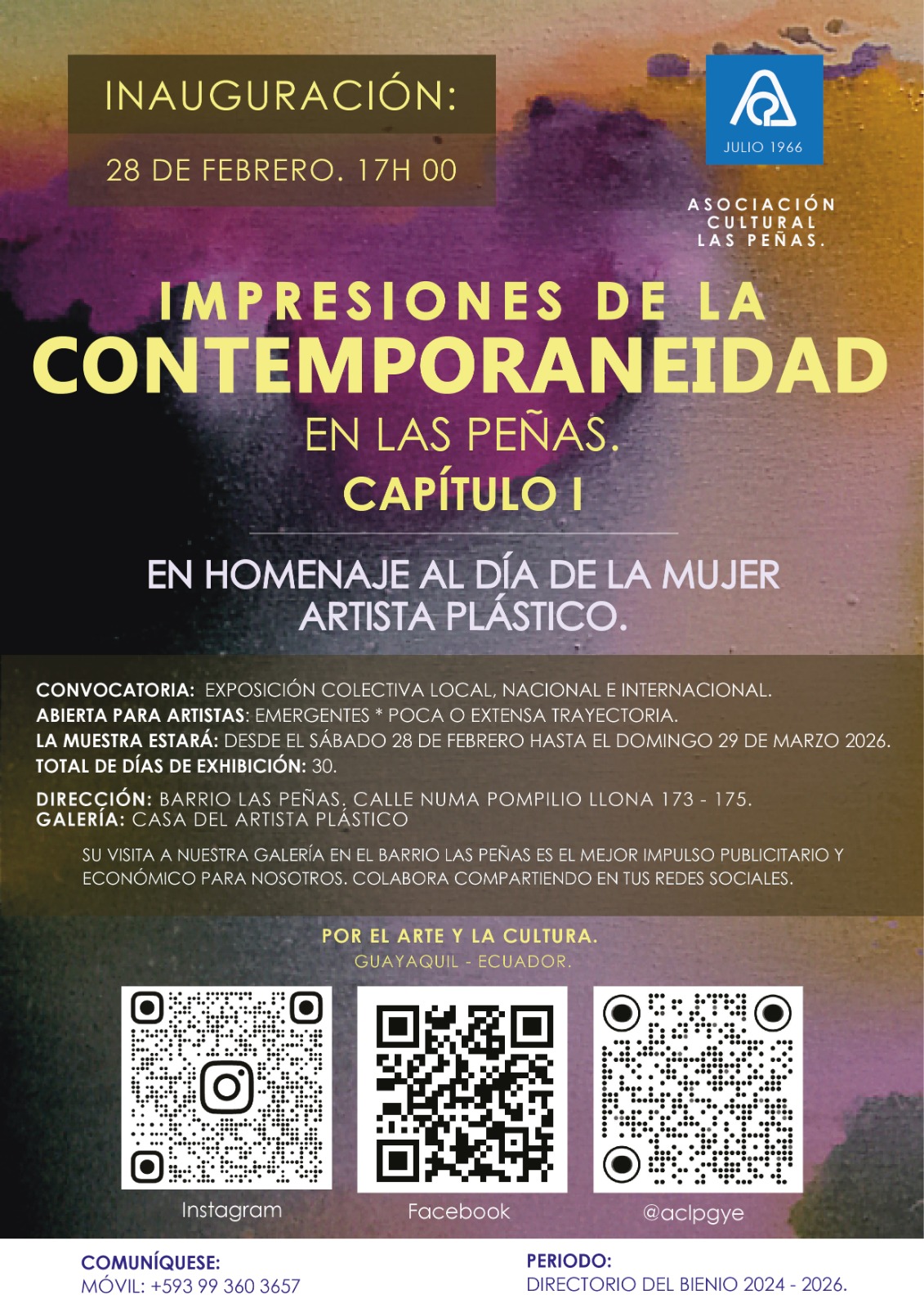 La Asociación Cultural Las Peñas tiene el alto honor de presentar la Exposición Colectiva Local, Nacional e Internacional “Encuentro entre Acuarelas y Plumillas en la Ría de Las Peñas”, un espacio que celebra la diversidad artística y la riqueza cultural de Guayaquil y del mundo.